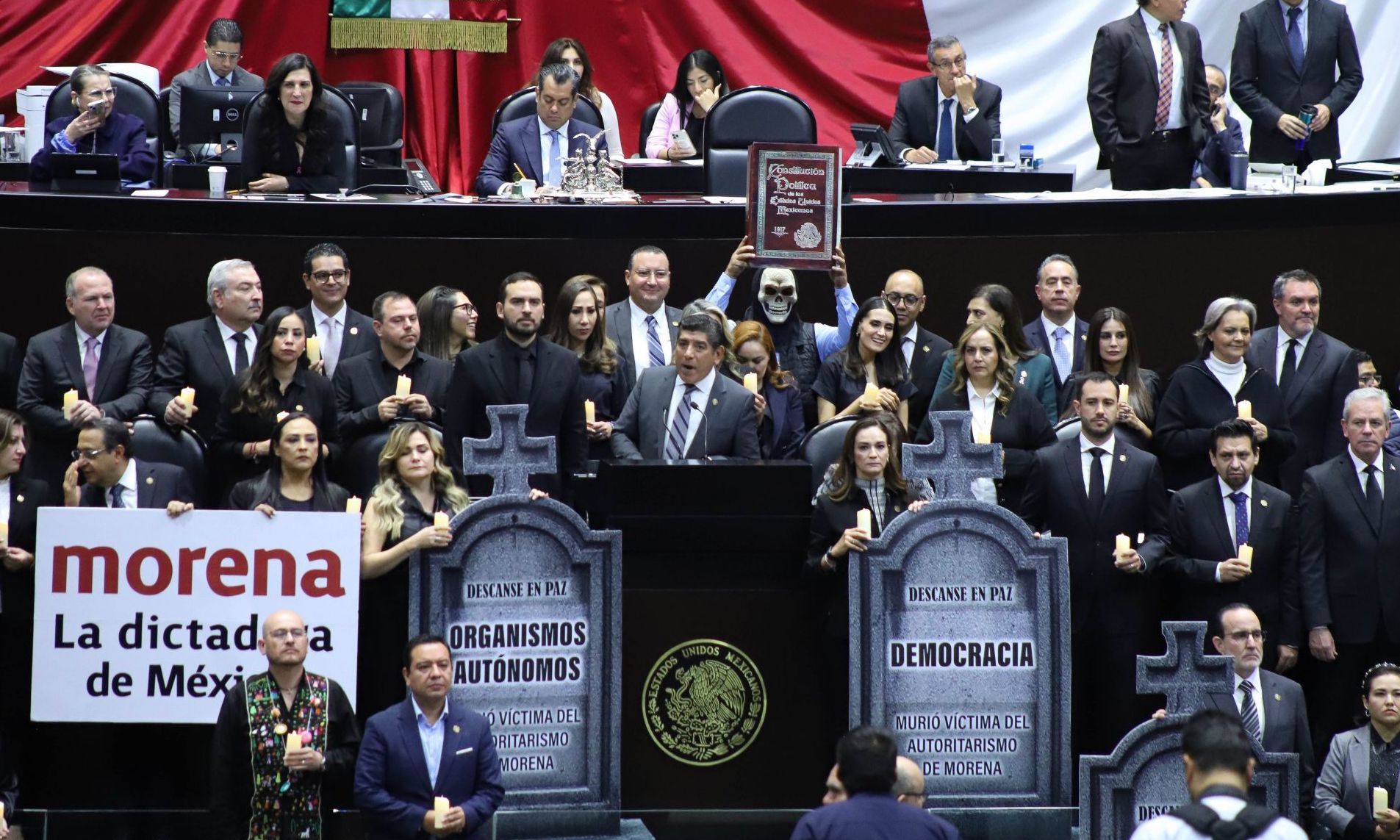 Esta vez la oposición recurrió a lápidas y veladoras por lo que acusaron como la muerte de la Constitución, dado que la mayoría de Morena y aliados avalaron el proyecto en materia de Supremacía Constitucional con cambios a los artículos 105 y 107 para otorgar un blindaje a las reformas a la Carta Magna ante cualquier impugnación.