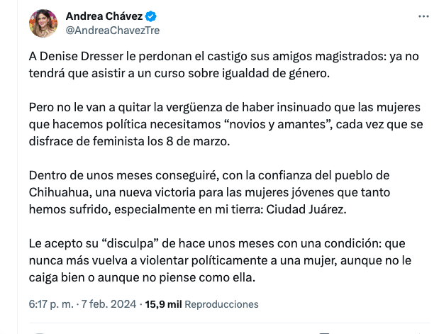Dresser acató la orden. “Las mujeres a veces podemos equivocarnos en el uso de ciertas palabras, y caer en lo que la autoridad electoral clasifica como ‘violencia política de género’. En ese estricto sentido, le ofrezco una disculpa a Andrea Chávez”, indicó, pero luego advirtió que impugnaría el fallo.