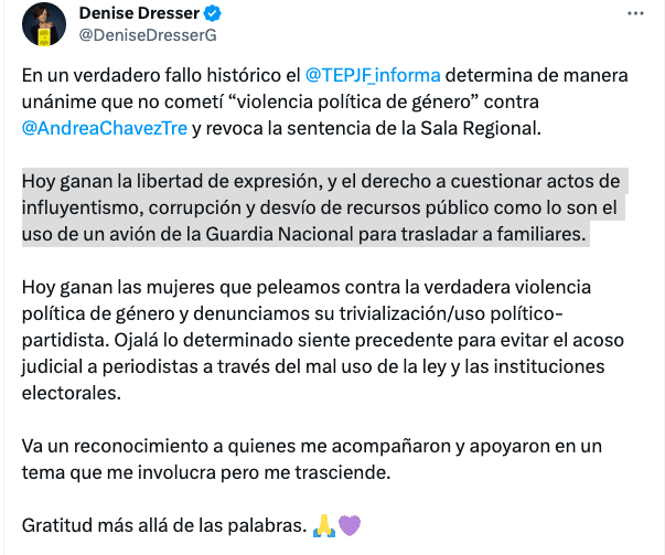 Por su parte, la periodista Denise Dresser celebró la decisión del Tribunal Electoral e insistió en el uso de un avión de la Guardia Nacional por parte de Andrea Chávez: “Hoy ganan la libertad de expresión, y el derecho a cuestionar actos de influyentismo, corrupción y desvío de recursos públicos, como lo son el uso de un avión de la Guardia Nacional para trasladar a familiares”.