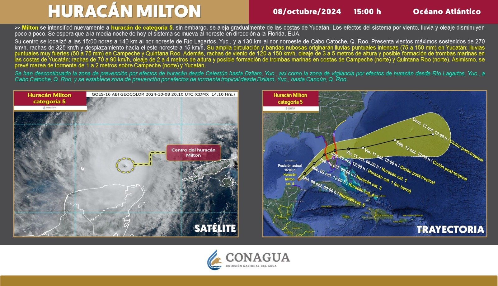 Conagua informó que a las 15:00 horas Milton estuvo 140 kilómetros al nor-noreste de Río Lagartos, Yucatán, y a 130 kilómetros al nor-noroeste de Cabo Catoche, Quintana Roo.