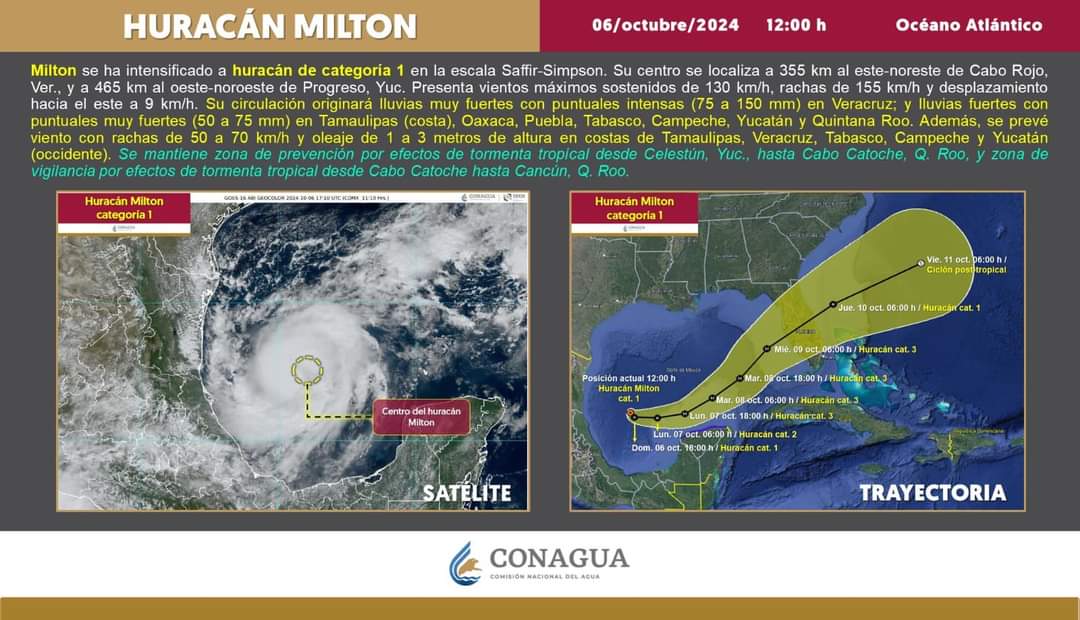 EMEEQUIS.- El Servicio Meteorológico Nacional anunció que la tormenta tropical Milton se intensificó a huracán categoría 1 en la escala Saffir-Simpson, en punto de las 12:00 horas de hoy.