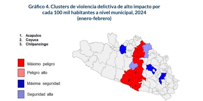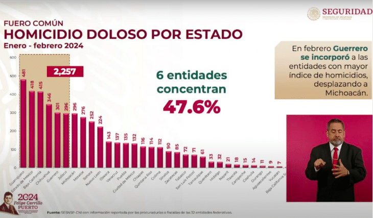 Guerrero en el quinto lugar del país en cuanto homicidios dolosos, informó el 19 de marzo la secretaria de Seguridad Pública Federal, Rosa Icela Rodríguez Velázquez. Tan sólo en enero y febrero de este año se cometieron 301, dijo la funcionaria.