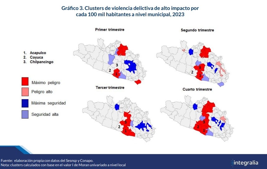 Además, otro hecho que ha dejado marcado al estado fue el impacto del Huracán Otis en Acapulco y que consigo, además de los daños materiales, acentuó la inseguridad y violencia no solo en la región cercana a Acapulco, Coyuca y Chilpancingo sino que se trasladó a otros municipios. Algunos delitos que crecieron en el Puerto fueron los robos por la falta de vigilancia y el cobro de piso a los operadores de transporte que aún trabajaban en el municipio. Esto, de acuerdo con un reporte realizado por Integralia.