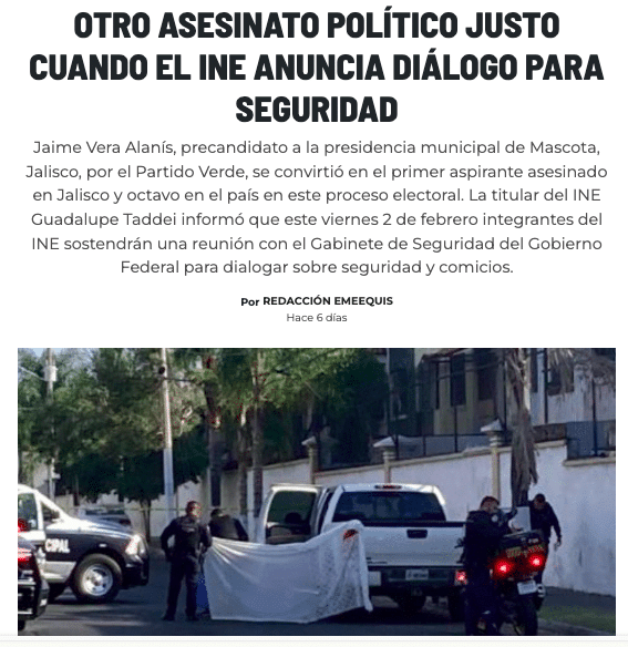 EMEEQUIS. – Con el homicidio de Cecilio Murillo y Juan Pérez Guardado, ya suman 10 asesinatos políticos en México en lo que va del proceso electoral 2024. Ambos crímenes ocurrieron en Zacatecas en menos de 24 horas. También se agregó el del empresario José Luis Olvera Fraga.