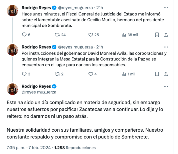 Cecilio Murillo, hermano del presidente municipal de Sombrerete, Alan Murillo, fue asesinado el pasado 7 de febrero al norte del estado de Zacatecas. El occiso era hermano del actual alcalde, perteneciente al PRI, y se postuló como candidato a la alcaldía de Sombrerete en dos ocasiones. En 2016, el occiso ocupó la presidencia de la Asociación Mexicana de Gasolineros en Zacatecas.